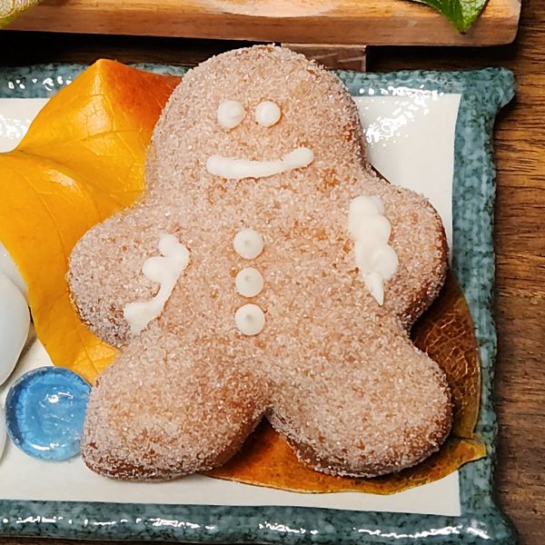 A gingerbread man-shaped donut with a sugar glaze and spiced ginger cream cheese filling – a festive holiday delight!
