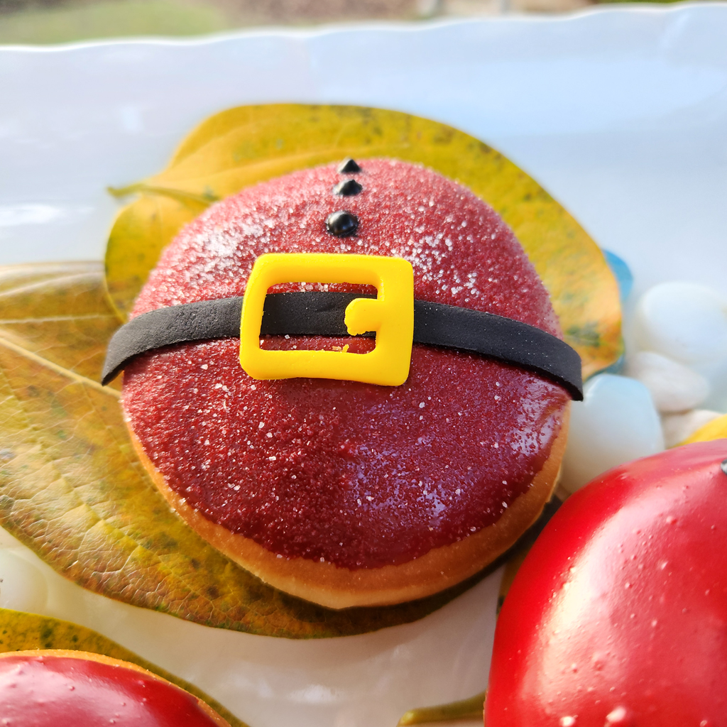 A festive Christmas donut featuring red icing and sprinkle sugar, a candy black belt, and a yellow buckle – inspired by Santa’s iconic outfit!