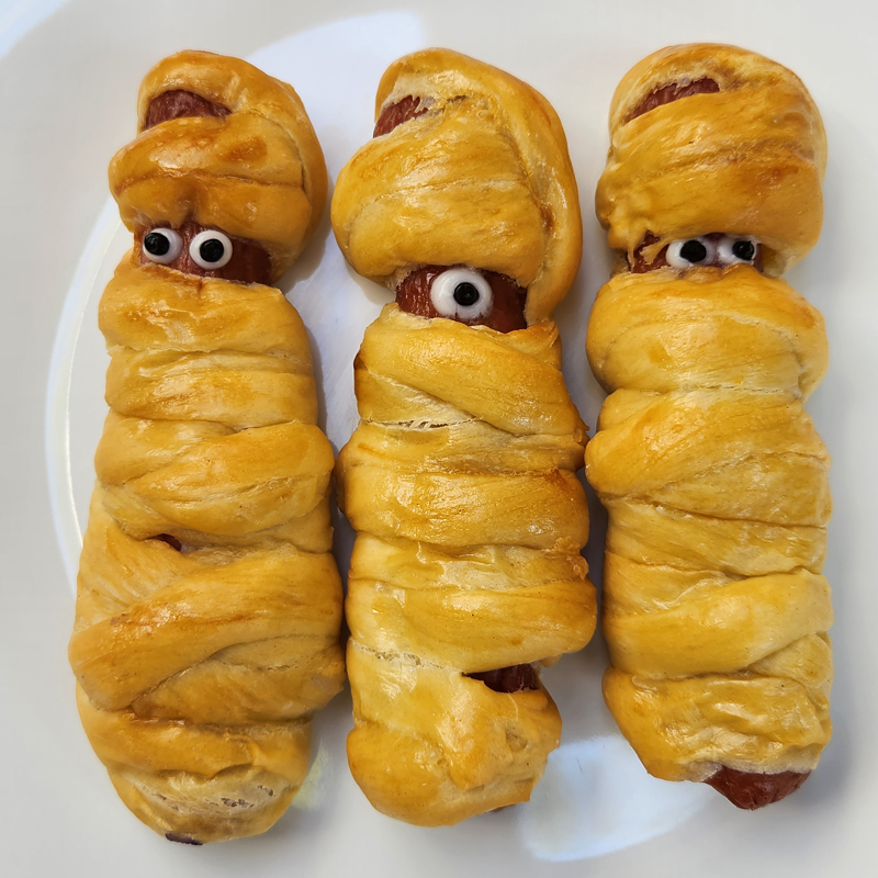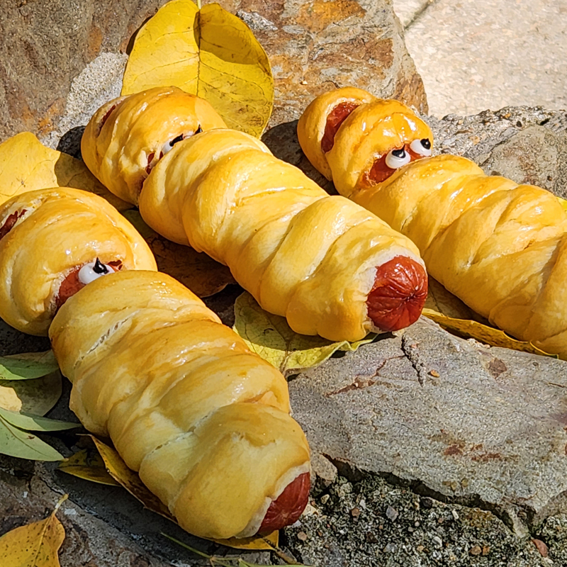 A scary good savory breakfast or snack! Our classic Jumbo Sausage Roll (Kolache) gets a Halloween makeover. A juicy Jumbo Sausage is carefully wrapped in our flaky, signature Kolache dough to resemble a spooky mummy, complete with fun candy eyes peeking out.